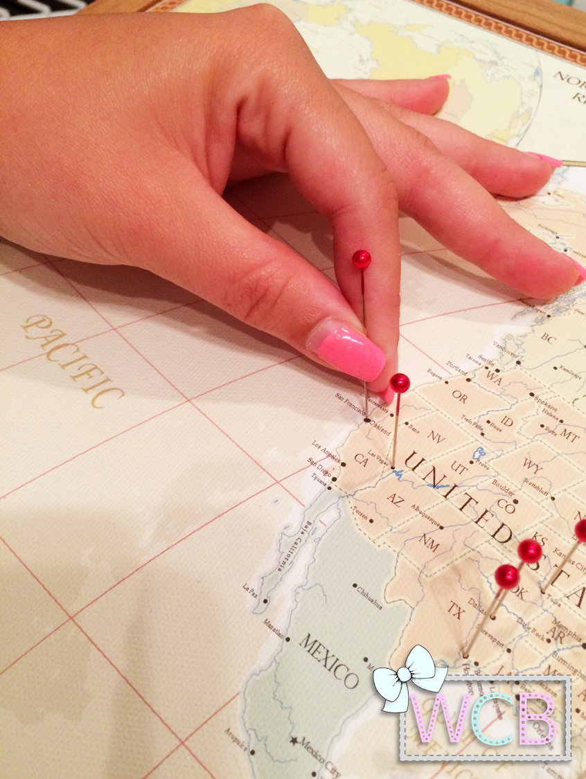 I glued the edges of the map (not the middle so it wouldn’t make the canvas too hard for the pins) to the cork board with some Beacon 527 Multi-Purpose Glue , which is literally my life and soul. I love that freaking glue! And then I wanted the map to kind of look like “dropping a pin” in real life, so I bought some red Loops & Threads Long Pearlized Pins at Michael’s, and started pinning away my prior travels. My map looks like it got chicken pox all over North & South America (and a tiny bit in Europe) and I love it! I’m doing my best to keep spreading the red all over 😉