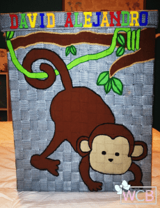 I started with the monkey in the front – my brother has always had a thing for monkeys and we knew that should be the predominant image. Then I went to one side and made the giraffe, and drew the elephant on the opposite panel. Even though the animals were cute, I felt they were missing something. Since the monkey looked like he was hanging from something, I started painting a branch for him, and proceeded to make a full blown tree run along the whole chest. Looking at the front, I realized that the panel on the top lid had enough tiles to fit his first and middle names, with spaces and everything! I went into my bag of wooden letters, jumped of excitement for having the ones I needed, painted and glued them on to make it even more stimulating for David.