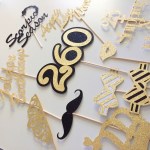 - Cake Table: I love the fact that plastic linens are just $2, but I wanted to add a little spunk to the table, and I had purchased some pretty white and gold glitter card stock when it was on sale (I knew I’d use it, just didn’t know how. HA! Thank you past Kathy for thinking ahead…) So I taped them together and used them as a table runner. I really like how that turned out, and it gave the table a little class and sass.