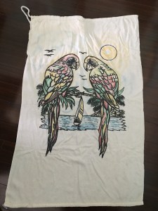 The first thing I’d like to highlight – and possibly the coolest – is this towel bag my tia “invented.” I’ve only just now seen a lot of different versions of this, but the first time I ever saw it was when my tia made them. They were a total hit and she made dozens of them, everyone wanted one. Since she lived in Santa Marta, which is a beach town in the coast of Colombia, these were super useful for everyone, because it’s a towel that wraps into its own bag, so you don’t have to stuff it into another bag where it won’t fit or carry it on your hand. It was genius. Still is.
