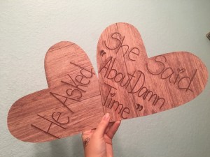Finally, Michelle’s mom asked me to make a version of these very funny props that say “He asked” and “She Said About Damn Time,” so I found some faux wood card stock and got to work. I also brought a long a set of my standard engagement props so that we could play around photo booth style after the proposal. All in all, it was a great first opportunity to put my craftskills to use, and the beginning of a loooonggg road of engagement-and-wedding-related crafting ahead!
