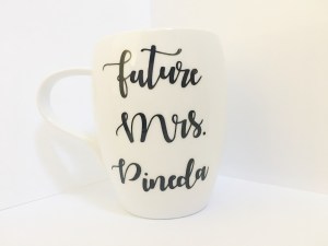 So first things first – I got a head start on the engagement surprise because her fiance reached out to me for some advice on the ring, and as soon as I got that text, you know my head went into overboard mode of what to make her/get her so I could put together a nice little “welcome to engaged life” gift for her. I wanted to give her a personalized mug, but the time frame was short, so I wouldn’t be able to place an order and thus, this would be my first wedding-related DIY project! I love all the “feyoncé” merchandise I’ve seen around, so I wanted to have the mug say that, but I didn’t want that to be the only thing on it… It had to be more personalized. So I decided to do something on both sides, and bam! Perfection.
