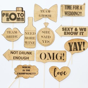 - The photo booth & props: Brian (Michelle’s fiance) is very handy, so Marta and I asked him to build a rustic-looking frame that we could drape and place in the garden to create a photo booth area. Brian did such an amazing job that I almost didn’t even want to dress the frame, but at the same time I’ve been loving the mixture of delicate with rustic/industrial so with his part done, it was time to make it pop. The fabric Marta found for the frame was shiny, shimmery & splendid. I also did a “she said yaaasss” banner, and added some vintage bulbs and baby’s breath to make it all come together. To finish the look, we hung a bunch of mismatched lamps from the tree, and it all looked beautiful both during the day and at night! For the props, I wanted to do something different from what I always do, since after all, props are kind of my niche… I actually started to design a completely different idea from what it ended up being, but I’m super happy with the end result. I used burlap paper, designed the props on PowerPoint, printed them out, cut & glued them to cardstock for hold and voila! Awesome props to complement an already great photo booth area!