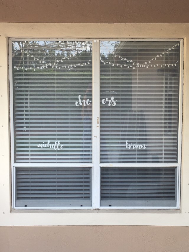 PS: Oh and one last thing – this was something new I decided to try: window cling! I wanted to make something for the bar area, so I went with some string lights, a “cheers to michelle & brian,” and that’s all she wrote! For real this time!